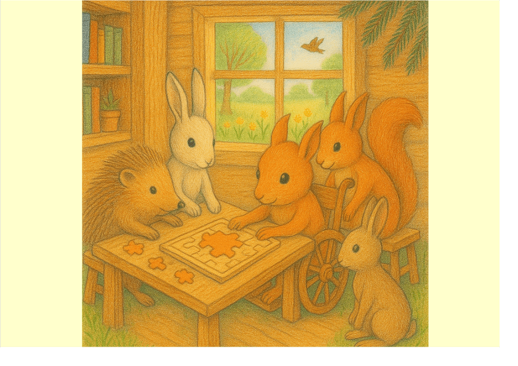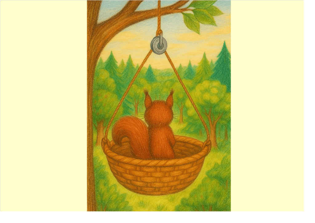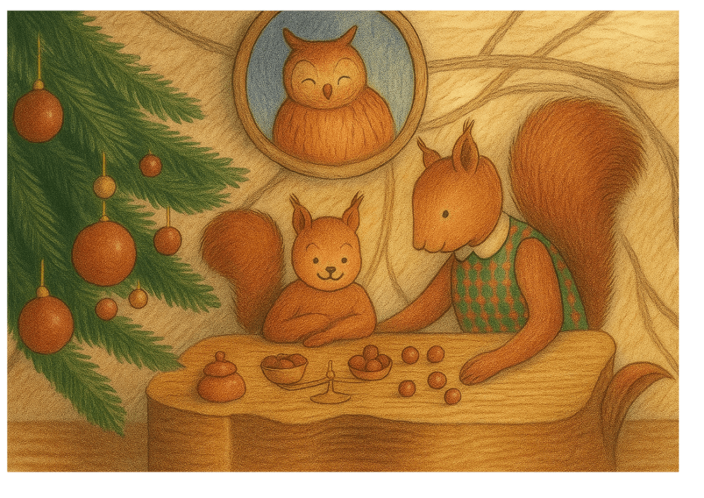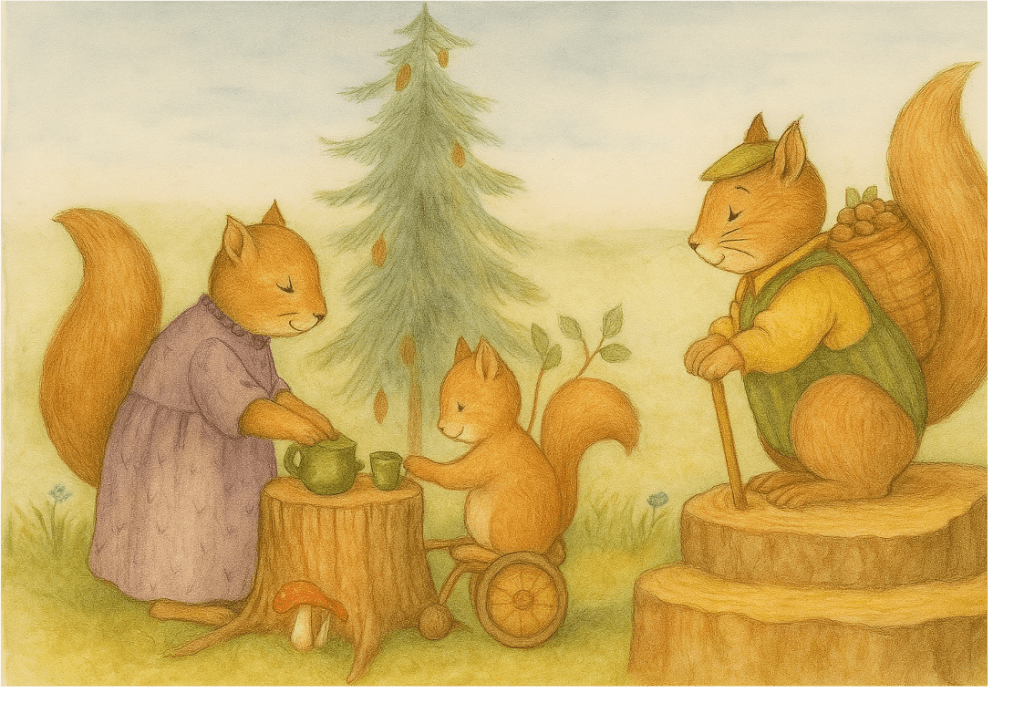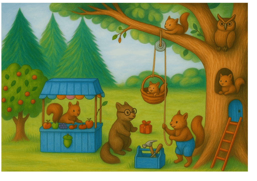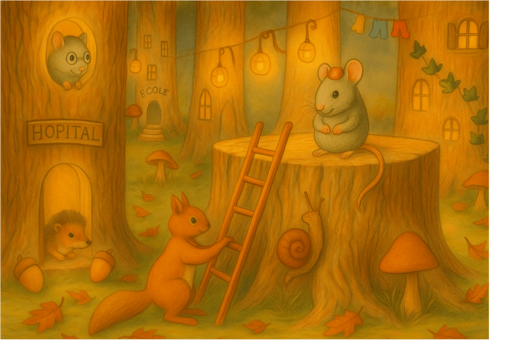 -Voyons, voyons, dit maman. Il y a bien un moyen d’adapter quelque chose pour que tu puisses contempler la forêt du haut des arbres. Nous allons y réfléchir. Quant aux noisettes et aux glands, bien de écureuils peuvent aller les récolter. Ce dont il ont besoin, c’est d’un petit futé qui sache les compter, les peser, gérer les stocks et les vendre.