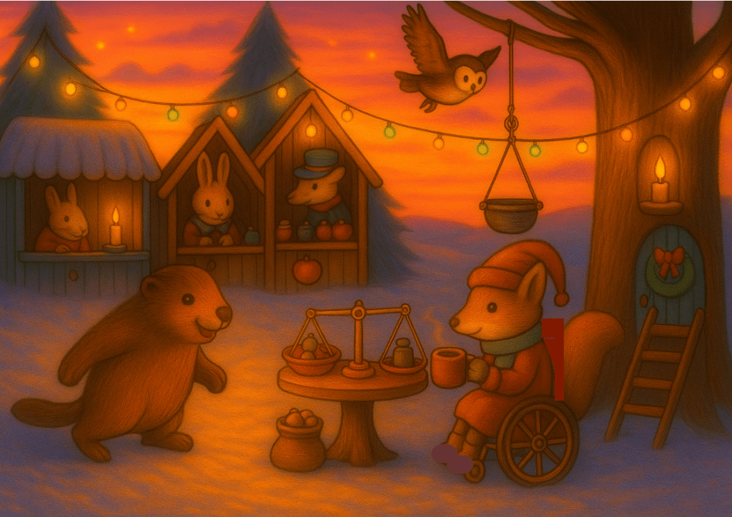 Grignotin a grandi. Quand vient le moment du grand marché de Noël, il reçoit l’honneur de tenir l’échoppe des Écureuils. Il a si bien travaillé qu’il peut à lui seul vendre les petits sacs de glands, de noix et de noisettes. Coiffé de son bonnet rouge, il se sent vraiment heureux. Maître Hibou est très heureux de voir les progrès de son petit élève.