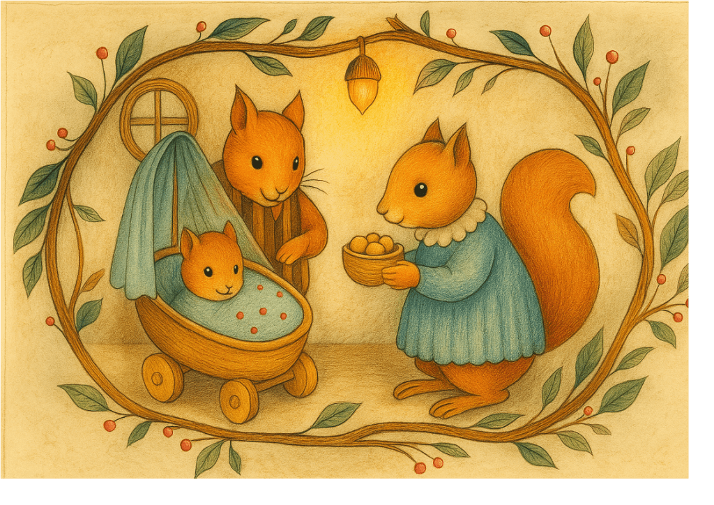 Ils appellent leur enfant Grignotin. Très fiers, ils annoncent à tous les habitants de la forêt leur joie de devenir les parents d’un petit écureuil aussi mignon.