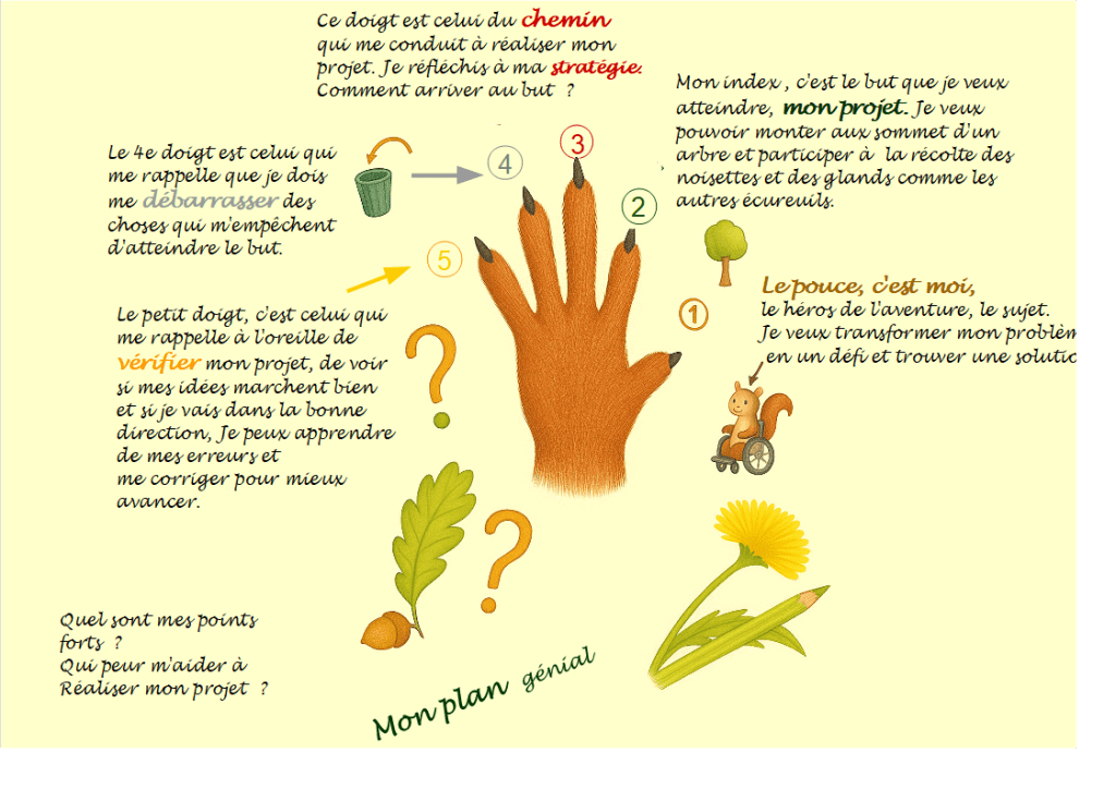 -C’est un très bon objectif, approuve maman écureuil. Mais regarde mon troisième doigt, le majeur: on va l’appeler le « rejet ». C’est là que nous mettons de côtés les choses qui nous empêchent de réaliser ton objectif. Par exemple, sauter de branche en branche n’est pas possible. Il faut mettre cela de côté, du moins pour le moment. Par contre, qui a dit qu’on ne peut pas monter à la cime d’un arbre autrement qu’en y grimpant? Qu’est-ce que tu penses qui t’empêche encore d’avancer vers le but?