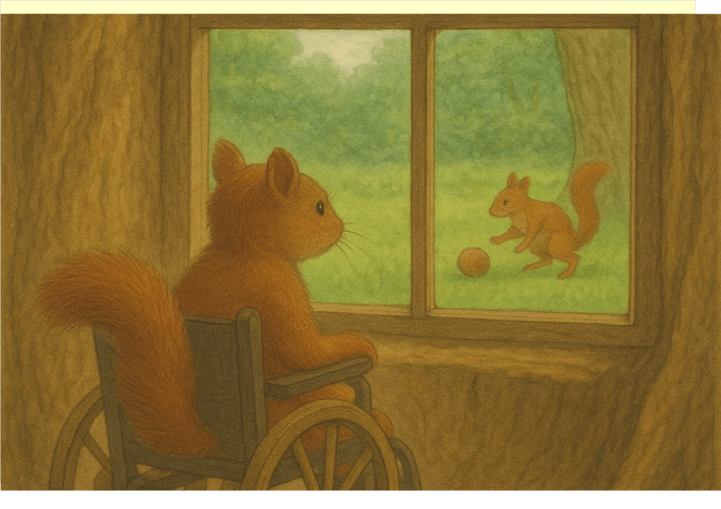 – Qu’allons-nous faire ? se demande papa Écureuil, qui voit là une véritable catastrophe. Un écureuil, c’est fait pour grimper aux arbres et sauter de branche en branche. Notre petit sera tout le temps en danger s’il ne peut pas marcher ni courir.