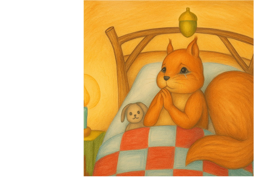 Parfois, le soir, tout seul dans son lit douillet, il pleure à chaudes larmes et se demande pourquoi le Créateur du Bois Touffu a laissé ce malheur arriver.. Il laisse s’échapper un soupir lourd de peine, comme une prière, et demande en chuchotant de pouvoir se réveiller avec des pattes capables de faire de lui un véritable écureuil. Pour Grignotin, un écureuil ne pouvant pas grimper aux arbres n’était pas un vrai écureuil. « Les écureuils, c’est fait pour sauter de branche en branche, cueillir des noisettes, des noix et des glands, et leur trouver une cachette pour l’hiver, » se dit-il.